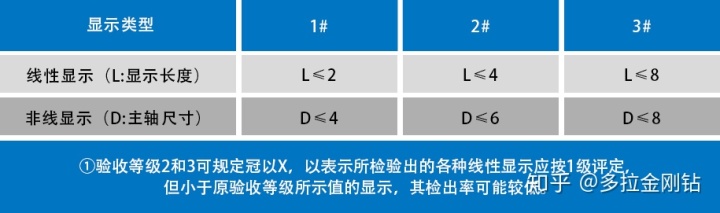 渗透检测的显示评定在渗透检测中将缺陷显示分为线性和非线性,线性显示是指长宽比大于3的显示,非线性显示是指长宽比小于等于3的显示。在标准ISO23277中规定了焊缝显示的允许极限,见下表: