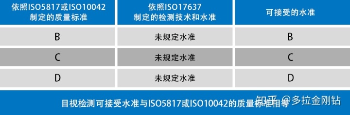 对于焊缝目视检测的应用标准和等级要求应满足ISO17635标准附录A中的要求,如下表所示: